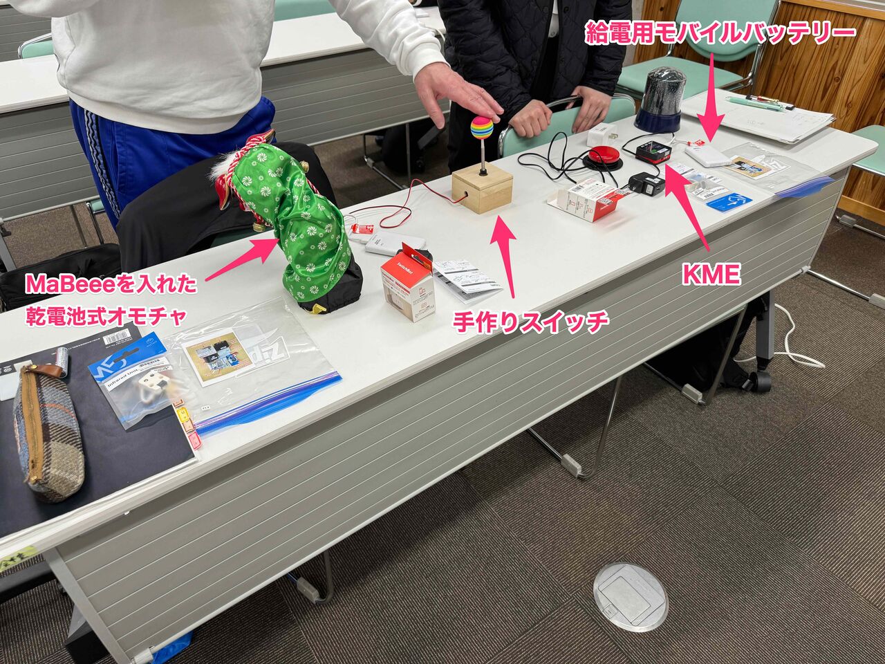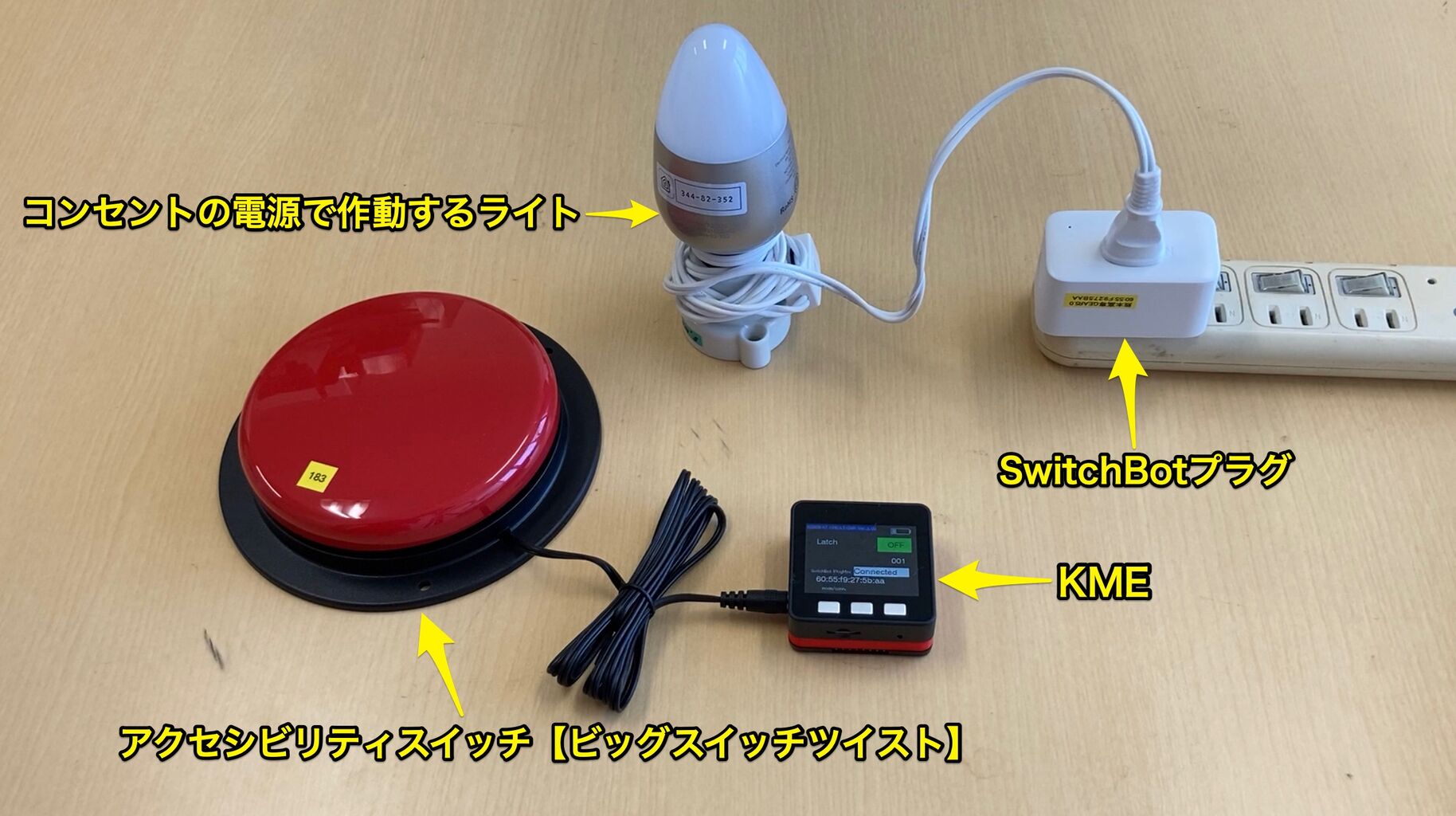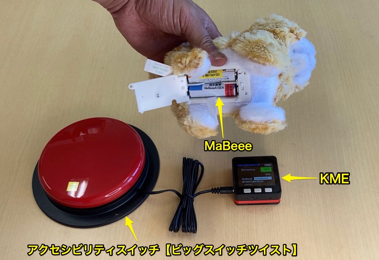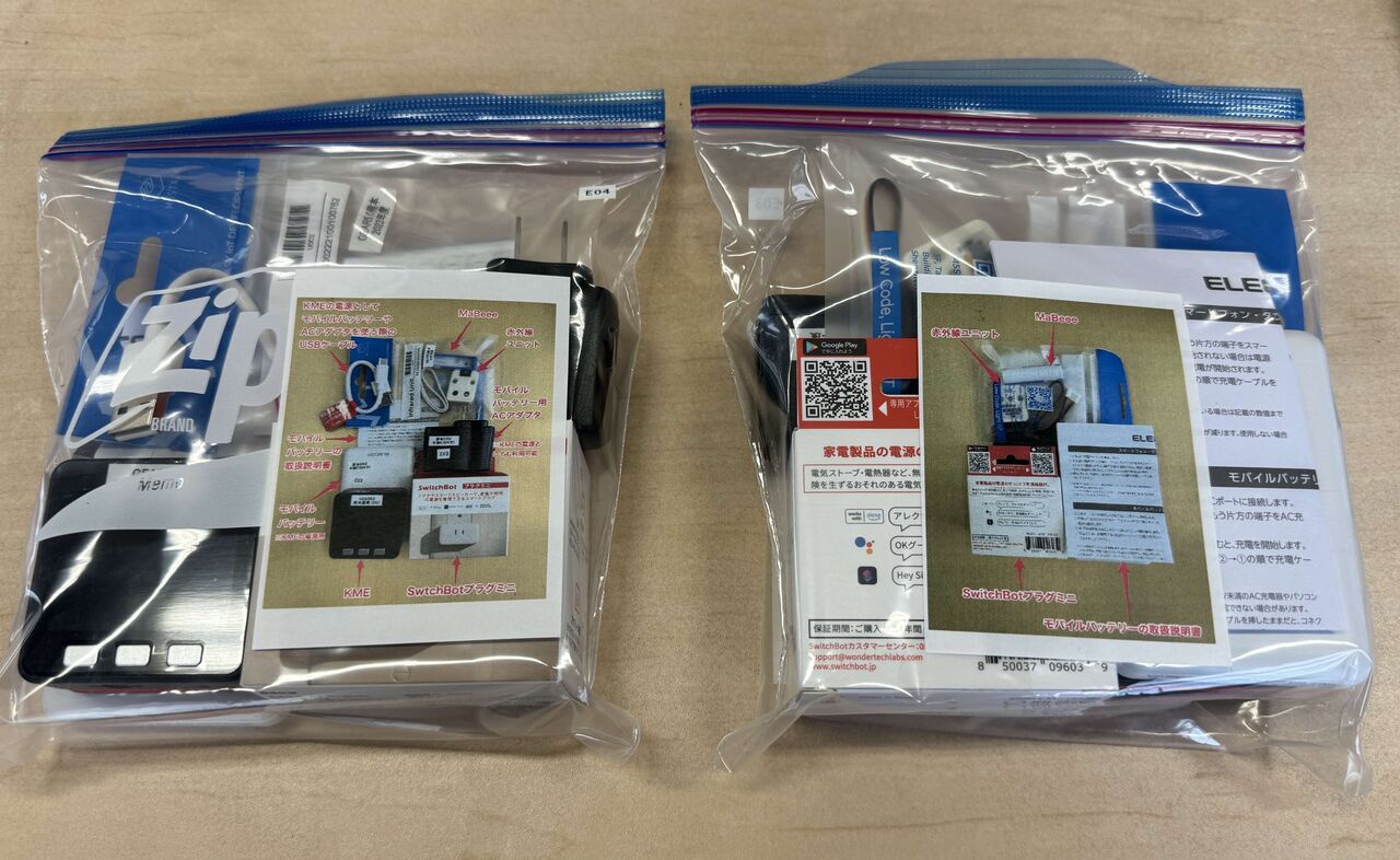 その中で「A支援学校のようにKME(KOSEN Multifunctional Endpoint)を貸してもらいたい」というニーズが寄せられ、MaBeeeやSwitchBotプラグミニ、給電用モバイルバッテリーとACアダプター、赤外線(IR)リモコンをセットにしてKMEを貸し出すことになりました。